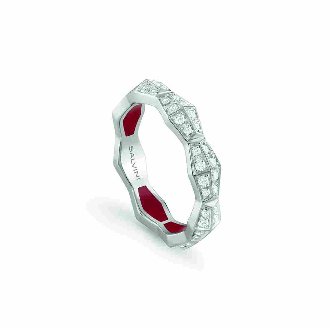 Anello in oro bianco con pavé di diamanti della nuova collezione Eva di Salvini con hybrid ceramic rossa.