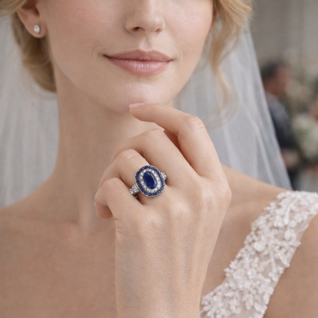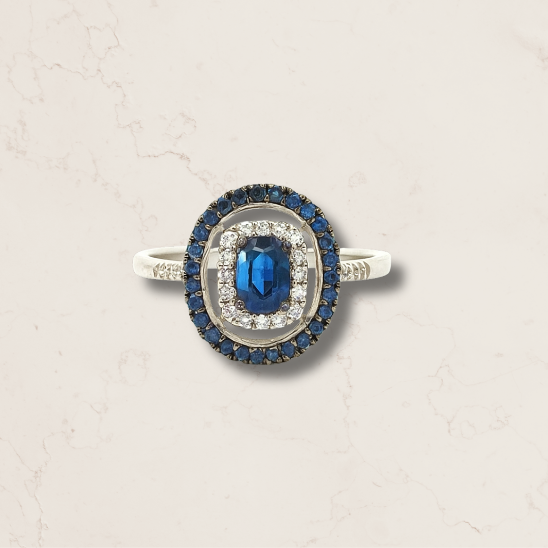 La pietra centrale è valorizzata da una preziosa cornice di diamanti taglio brillante e da un delicato cerchio di zaffiri, che donano luminosità e armonia all’intero design.