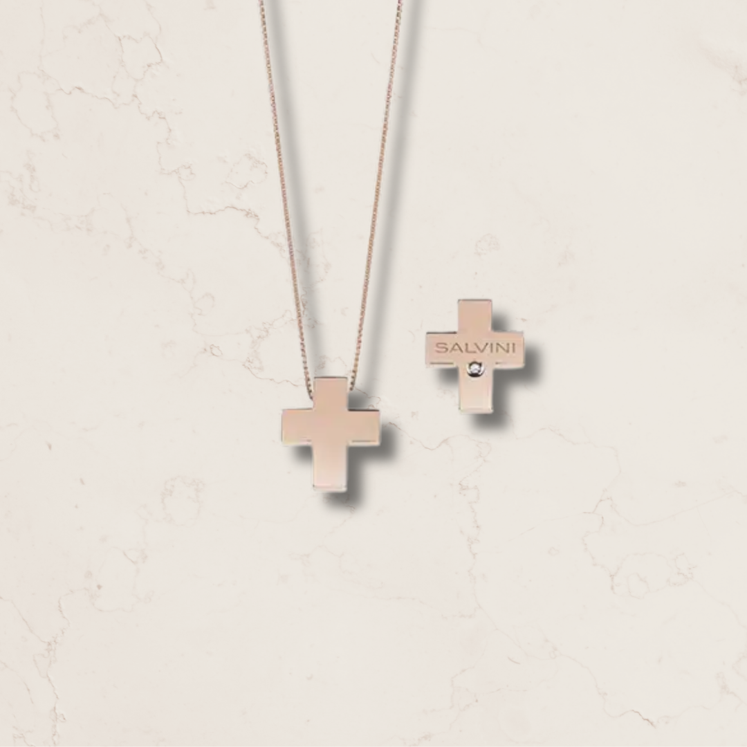 Questa collana Salvini della collezione I Segni è realizzata in oro rosa 18 kt e definita da una croce dalle linee pulite, attraversata da un diamante da 0,01 carati, colore GH, che introduce un punto luce discreto e misurato.