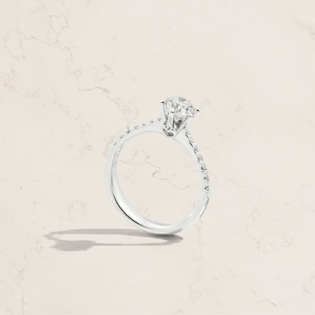L’oro bianco 18 kt accompagna una selezione di diamanti naturali taglio brillante, con colore E e purezza SI, creando un equilibrio preciso tra luminosità e proporzione. Il gambo impreziosito da diamanti aggiunge profondità e continuità visiva, senza appesantire la linea.