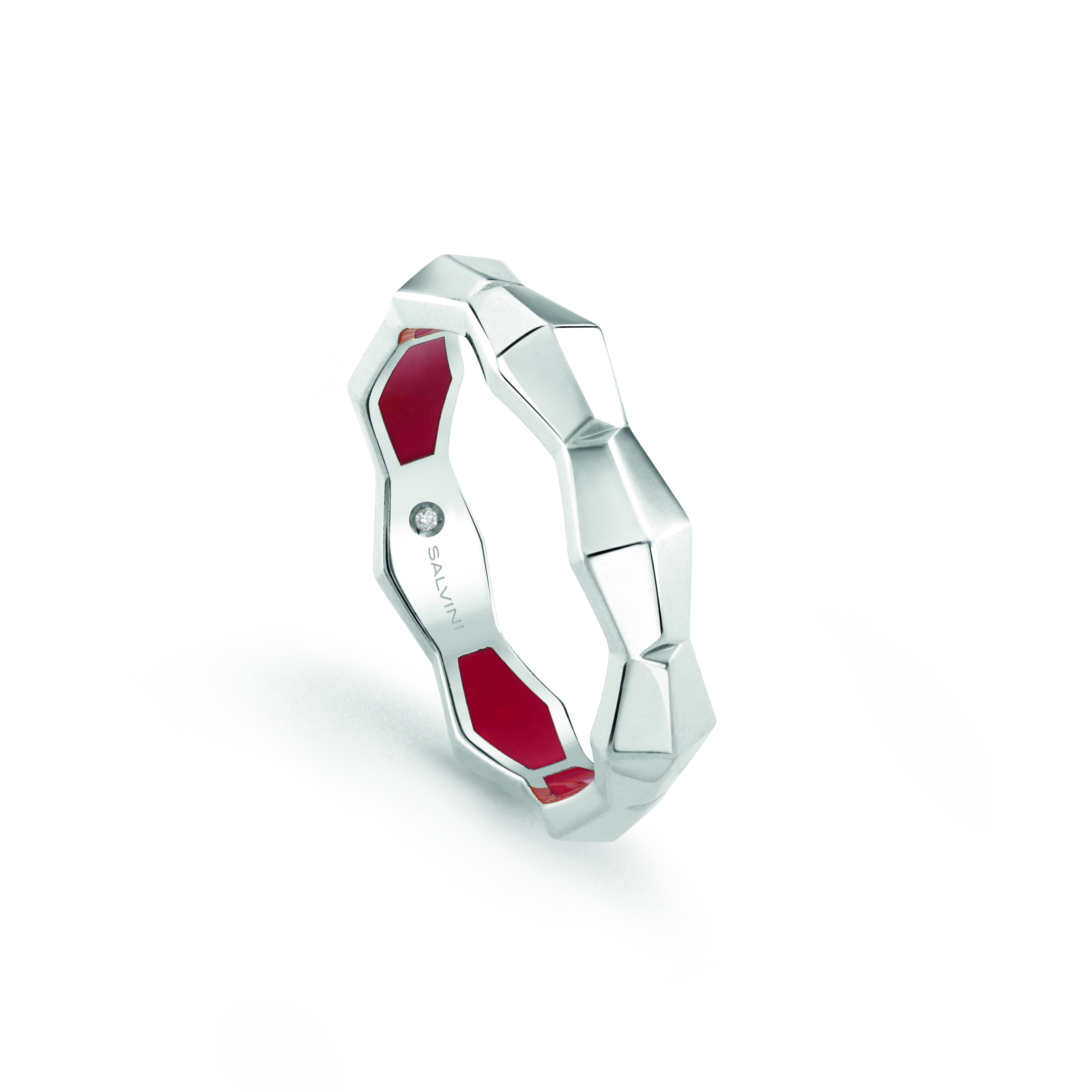 Questo anello ha la particolarità di avere al suo interno dei cuscinetti che permettono all’anello di adattarsi al dito e di potersi allargare fino a tre misure. Questo permette di poter spostare l’anello da una mano all’altra, oppure di poterlo utilizzare anche quando nei mesi estivi il dito è leggermente più gonfio. È possibile abbinare questa versione allo stesso modello in oro bianco.