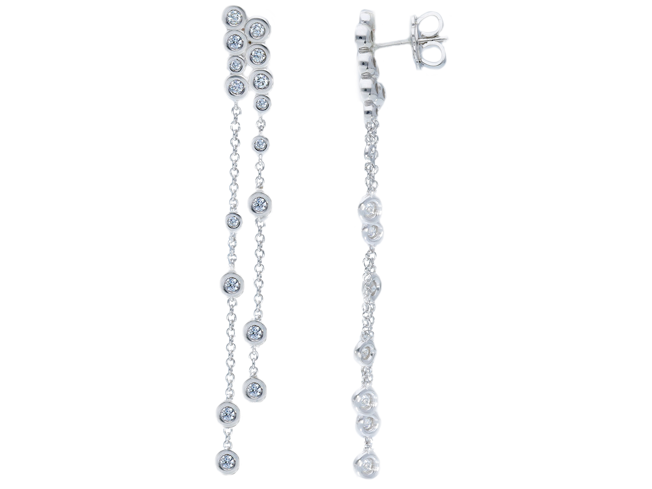 Orecchini pendenti in oro bianco 18kt, con doppia fila di diamanti taglio brillante di ct 0,73 di colore bianco extra G e purezza SI. REF 203704
