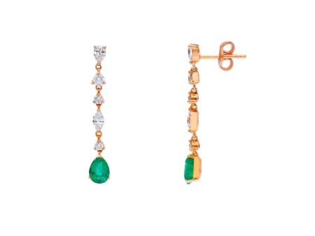Orecchini pendenti in oro rosa 18 kt, con incastonati diamanti di taglio goccia, navette e brillante di ct 0,94 e smeraldi a goccia di ct 1,00. Ref 230909