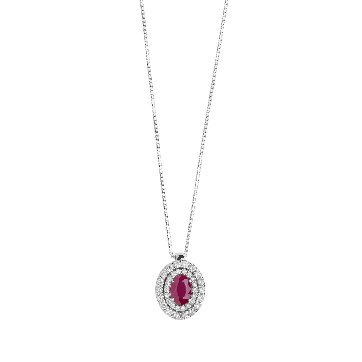 Girocollo in oro bianco 18 kt, con rubino di taglio ovale di ct 0,60 e doppio giro di di diamanti taglio brillante di ct 0,34 di colore bianco extra G e purezza SI.  Ref GLB1473