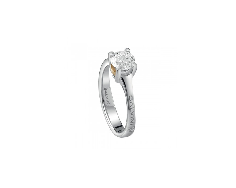 Lo scintillio di un brillante racchiuso in un innovativo e originale sistema di griffe modellate sul disegno del cuore. Il simbolo dell’amore appare anche sul fondo dell’incastonatura, a contatto con il dito come a sancire una promessa eterna, sul gambo esterno dove viene impreziosito con il bagliore di un piccolo diamante. Esclusiva anche la montatura con bastina in oro rosa che riprende la femminilità e l’allure del colore istituzionale Salvini.